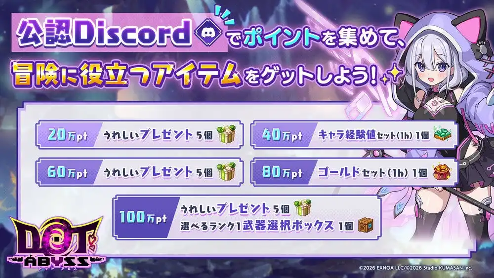 『ドットアビス』公認Discordでは編成の相談などプレイヤー同士の交流の場として活用できます。さらに、公認Discordでポイントを集めると、冒険に役立つアイテムをゲーム開始時にプレゼントいたしますので、この機会にぜひご参加ください。 |