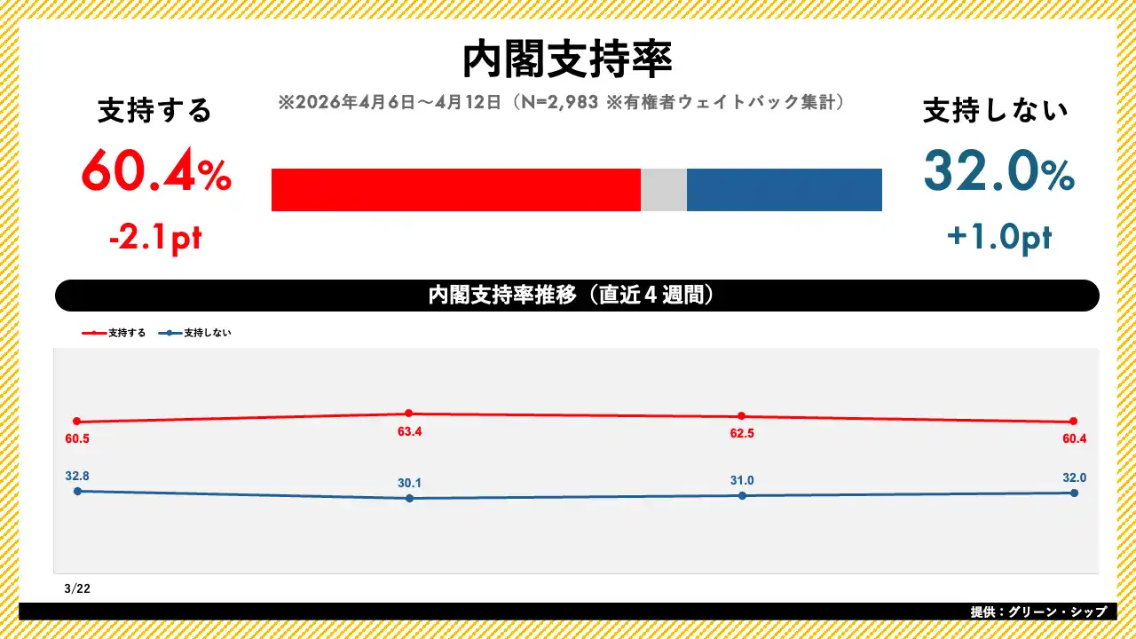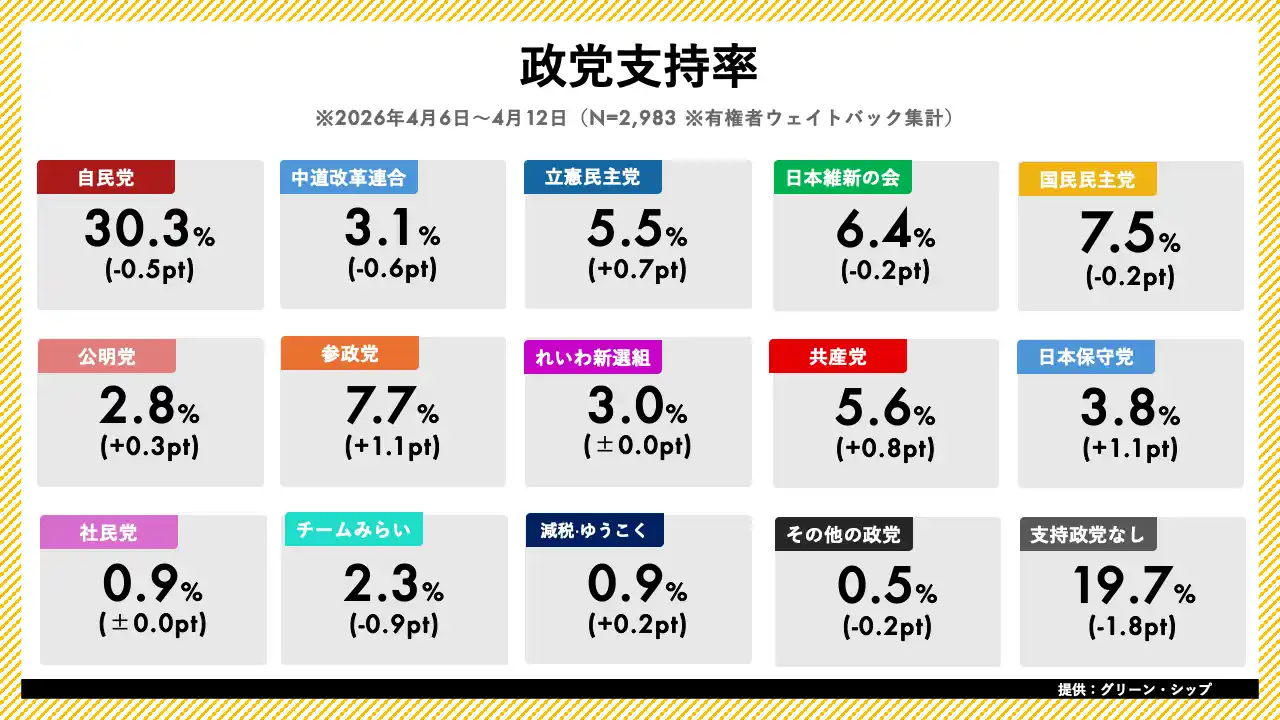 | ジャッグジャパン株式会社(本社:東京都渋谷区)は、株式会社グリーン・シップ(本社:東京都千代田区)と業務提携し、グリーン・シップが提供する日次世論調査「世論レーダー」のデータを提供しております。本日、2026年4月第2週(4月6日~4月12日分)の内閣支持率・政党支持率調査の結果を発表いたします。 | |||