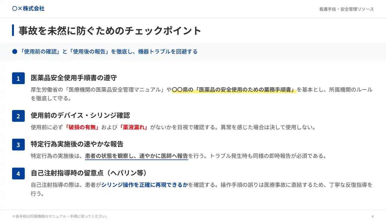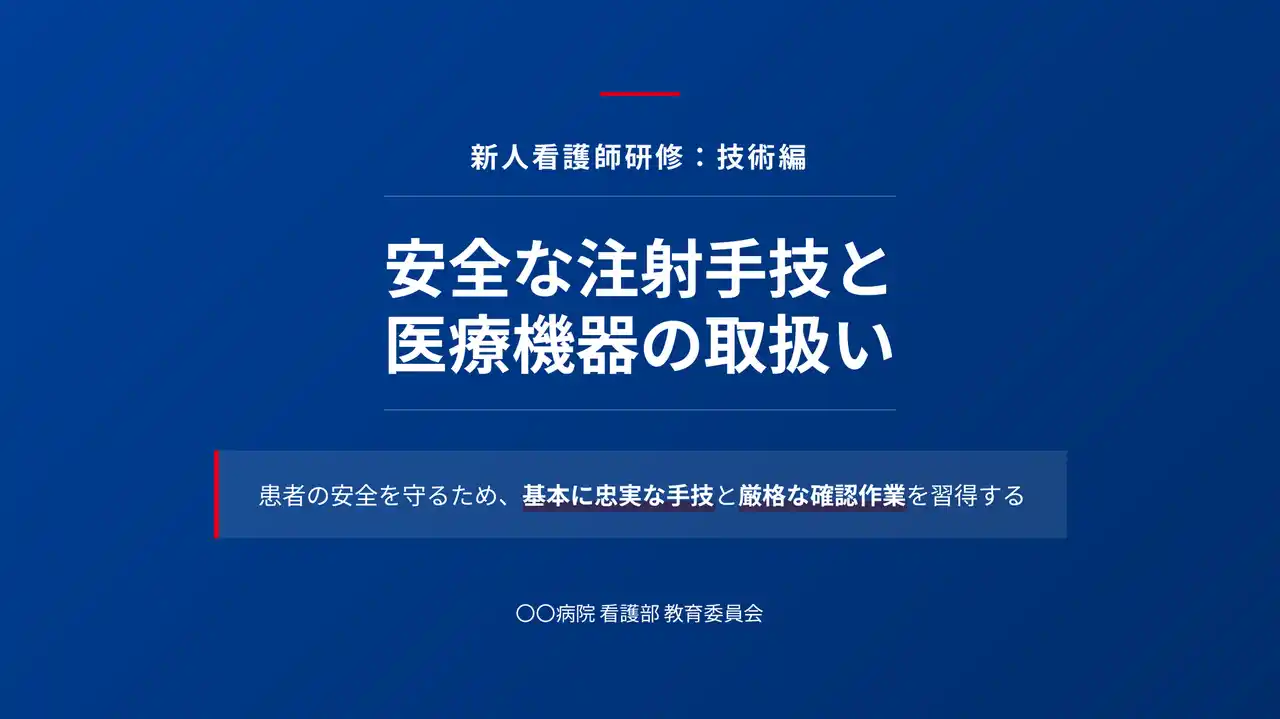 4つ目は「新人向け研修スライド(注射手技等)」です。新人看護師・医療スタッフを対象に、注射手技や医療機器操作の手順をまとめた研修スライドを生成できるサンプルです。4月の新人研修時期に大量の研修資料が必要になりますが、教育担当看護師の通常業務と並行した制作では量産が追いつかないという課題に対応しています。研修テキストや手技マニュアルPDFを素材として投入するだけで、手順ごとの図解付き研修スライドを効率的に作成でき、新人研修時期の資料制作負担を大幅に軽減することが可能です。 |