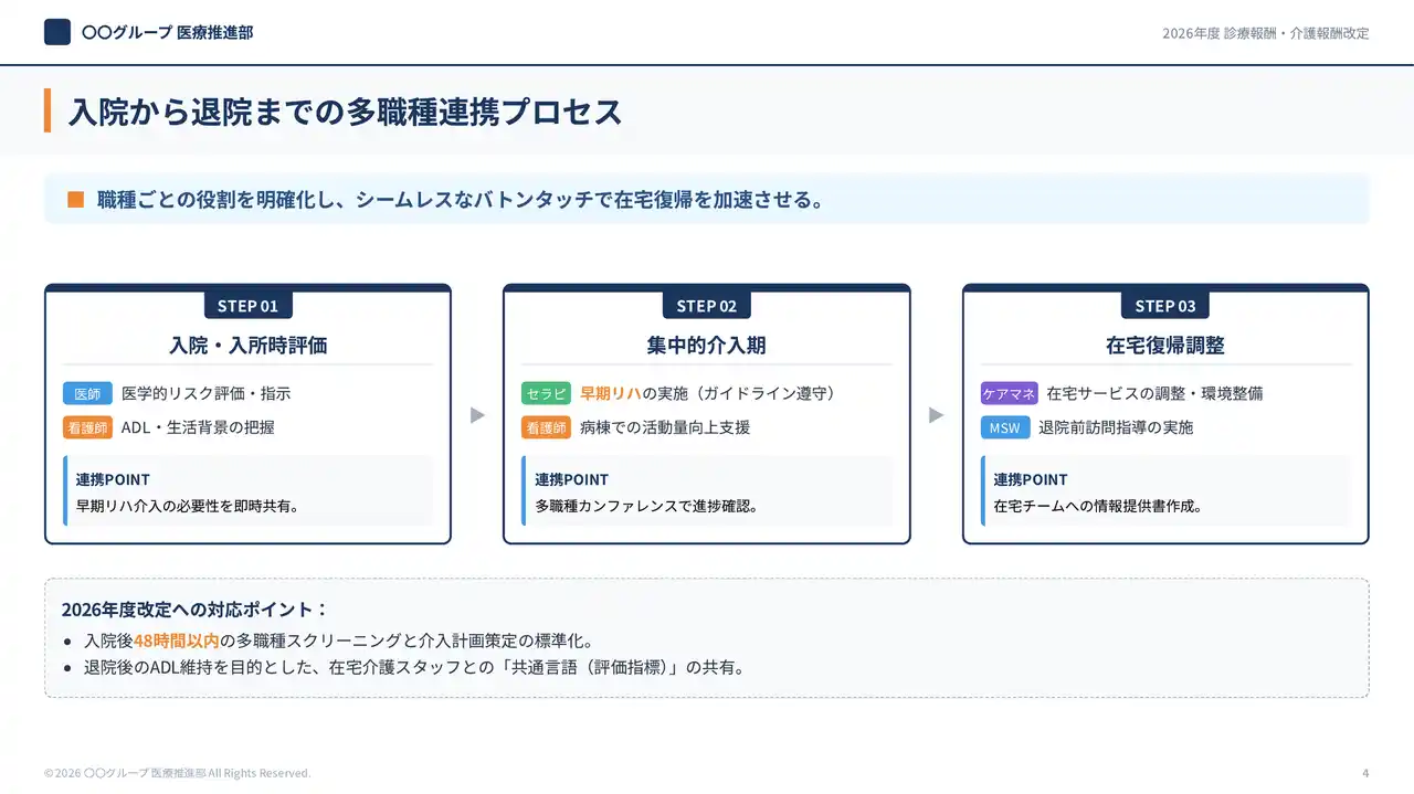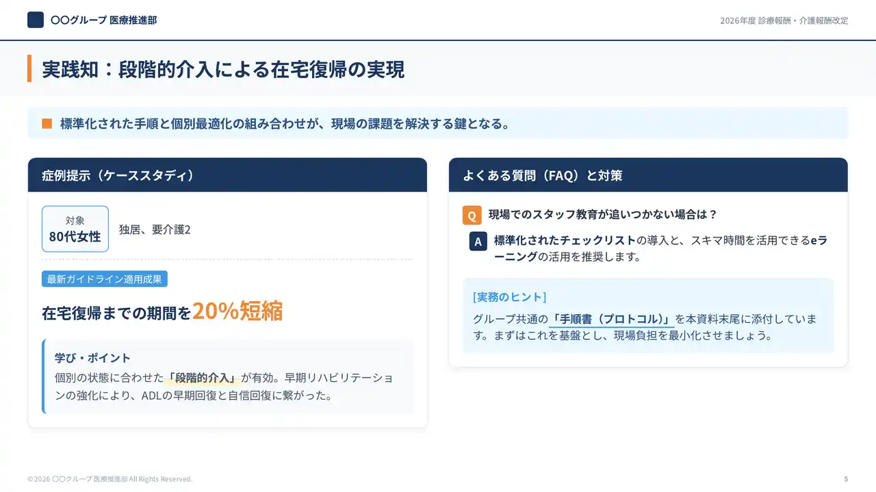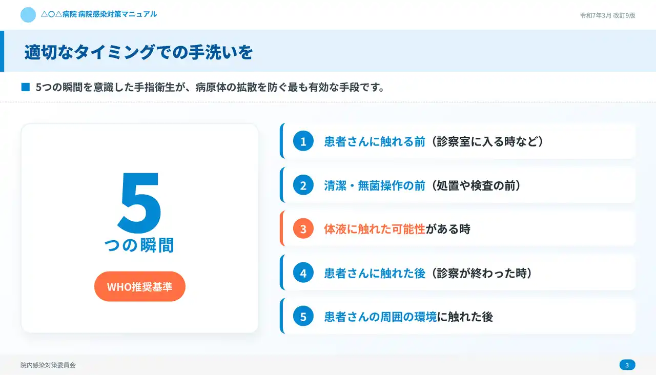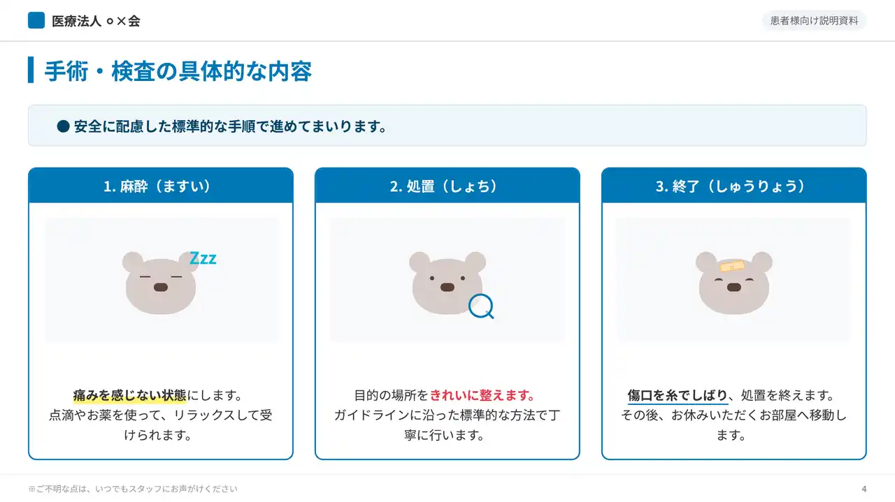 今回追加した医療業界向けサンプルスライドの中から、代表的な5つの活用例を紹介します。いずれも、病院・クリニックで頻繁に発生する患者説明・研修・院内展開のニーズに対応しています。 |