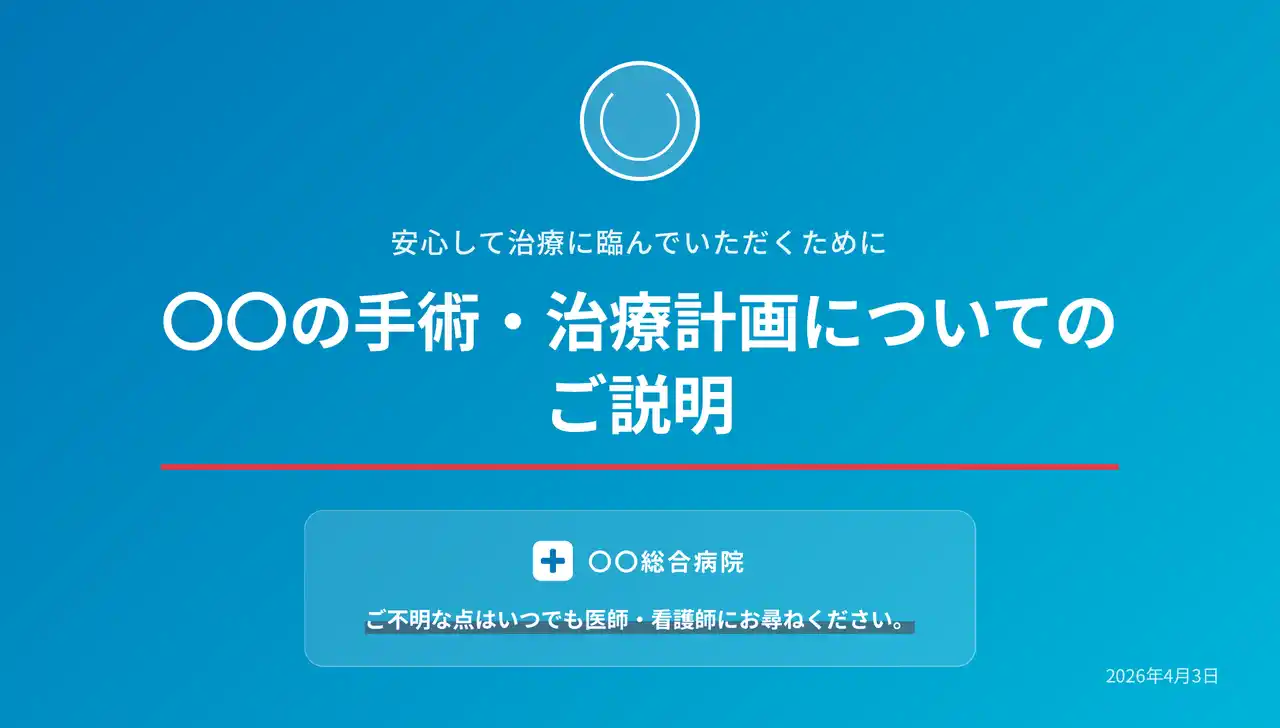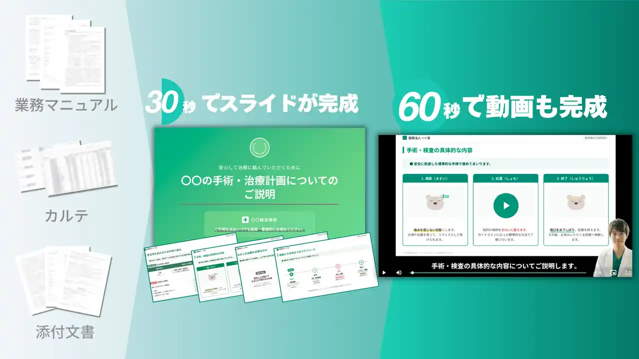 病院・クリニックでは、患者への検査・手術・治療の説明、新人看護師研修、ウェビナー登壇など、医療従事者が「伝える・理解してもらう」ための資料作成業務が日常的に発生します。インフォームドコンセントの重要性が高まる一方、医師・看護師の時間は診療業務で大きく圧迫されており、限られた時間のなかで説明資料の質を維持することが現場の課題となっています。 |