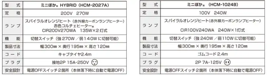 200V仕様の「ミニぽか(R) HYBRID」は、「スパイラルオレンジヒート」と「赤色コルチェヒーター(R)」を組み合わせた構造を採用しています。 |