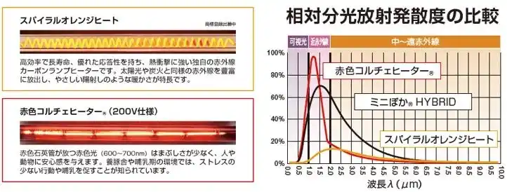 異なる赤外線波長をバランスよく活用することで、深部加温効果と視覚的な暖かさを両立し、動物が快適に暖を取れる環境を実現します。 |