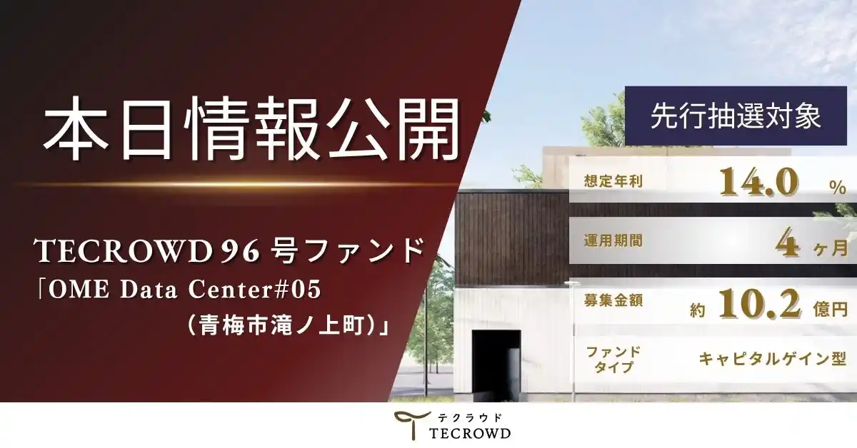 この度、新たにTECROWD96号ファンド「OME Data Center#05(青梅市滝ノ上町)」 を2026年4月14日(火)に情報を公開し、先行抽選受付を開始します。 |