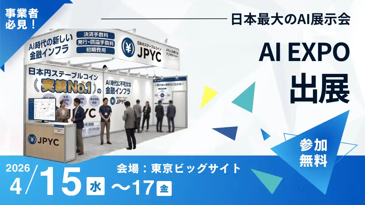 日本円ステーブルコイン「JPYC」を取り扱うJPYC株式会社(東京都千代田区、代表取締役:岡部 典孝)は、2026年4月15日から3日間、東京ビッグサイトで開催される「Nextech Week 2026 ~ 第10回 AI・人工知能 EXPO [春] ~」に出展することをお知らせします。 |