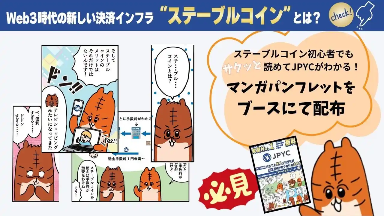 初めての方でも数分でステーブルコインが理解できる「漫画でわかるステーブルコイン」チラシに加え、発行・償還プラットフォームの最新情報をまとめた「JPYC EX サービス概要フライヤー」を配布します。 |