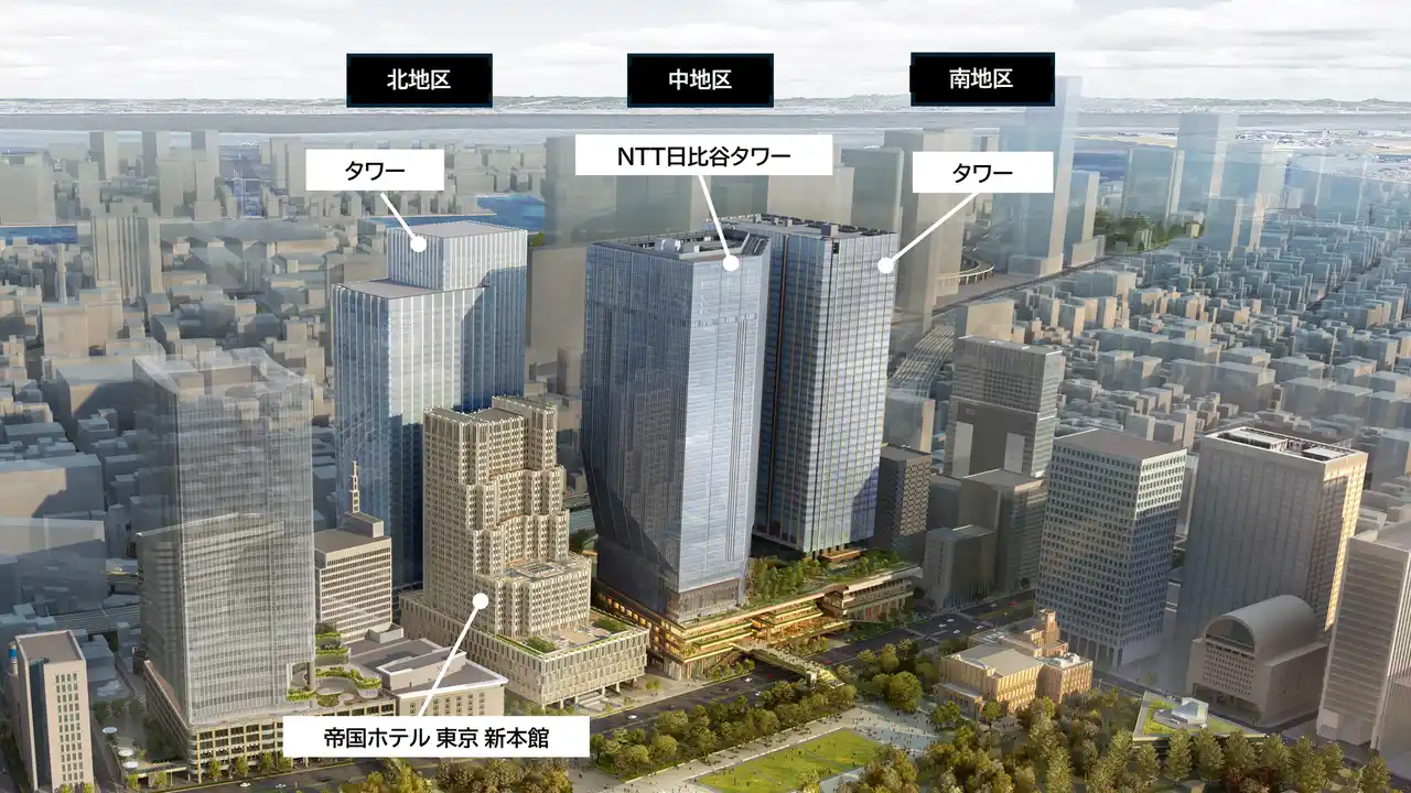 本プロジェクトは北地区・中地区・南地区の3つの地区で構成されており、オフィス、商業、ホテルなどの多様な用途から構成される、都心最大級延床面積約110万平方メートル の大規模複合開発です。全体完成に向けて、2028年度に南地区のタワーが、2031年度に中地区のNTT日比谷タワーが順次竣工予定です。 |