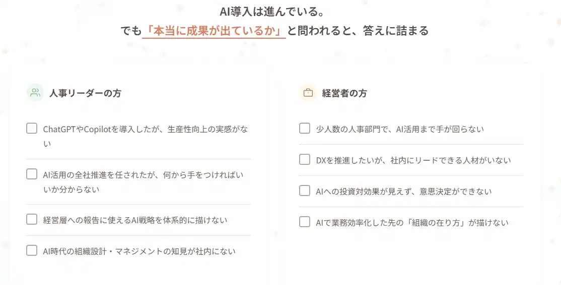 ・ 人事責任者/経営者 ・ 人事・人事企画・HRBPのリーダー ・ AX/DX推進部門の人事連携担当 ・ 経営企画・事業部人事責任者 ・ 経営人事に携わる方 |