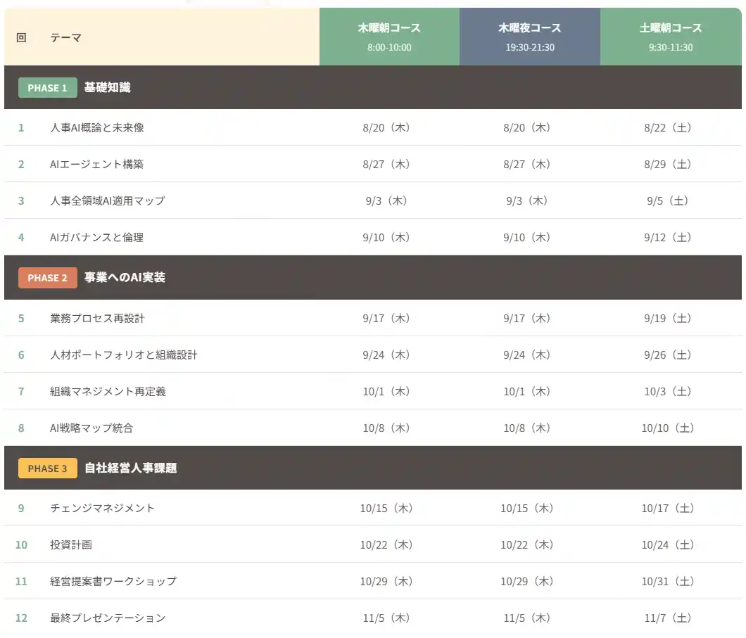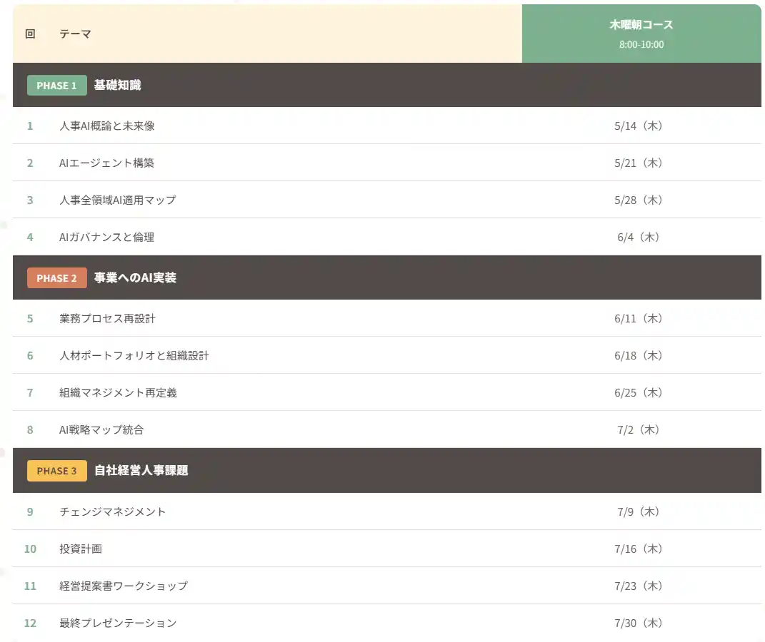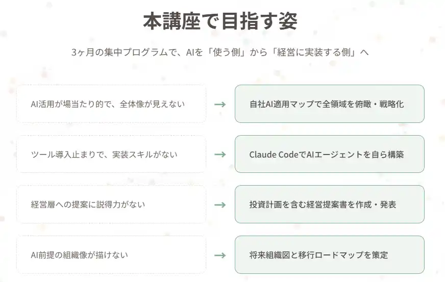 | 本講座では最新の国内外事例を用いながら、Claude CodeなどAIエージェントの実装、AI前提の組織設計やマネジメント再定義などを行います。3か月間の集中的なインプットと実践により、短期間で経営人事AIプロフェッショナルとして活躍できる力をつけ、講座進行中から自社の経営人事をアップデートに取り掛かれる状態を目指し、講座終了後も社内でAI×経営人事をリードできることをゴールとしています。 | |||||||||||||||