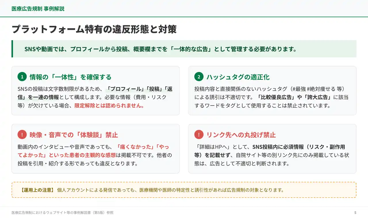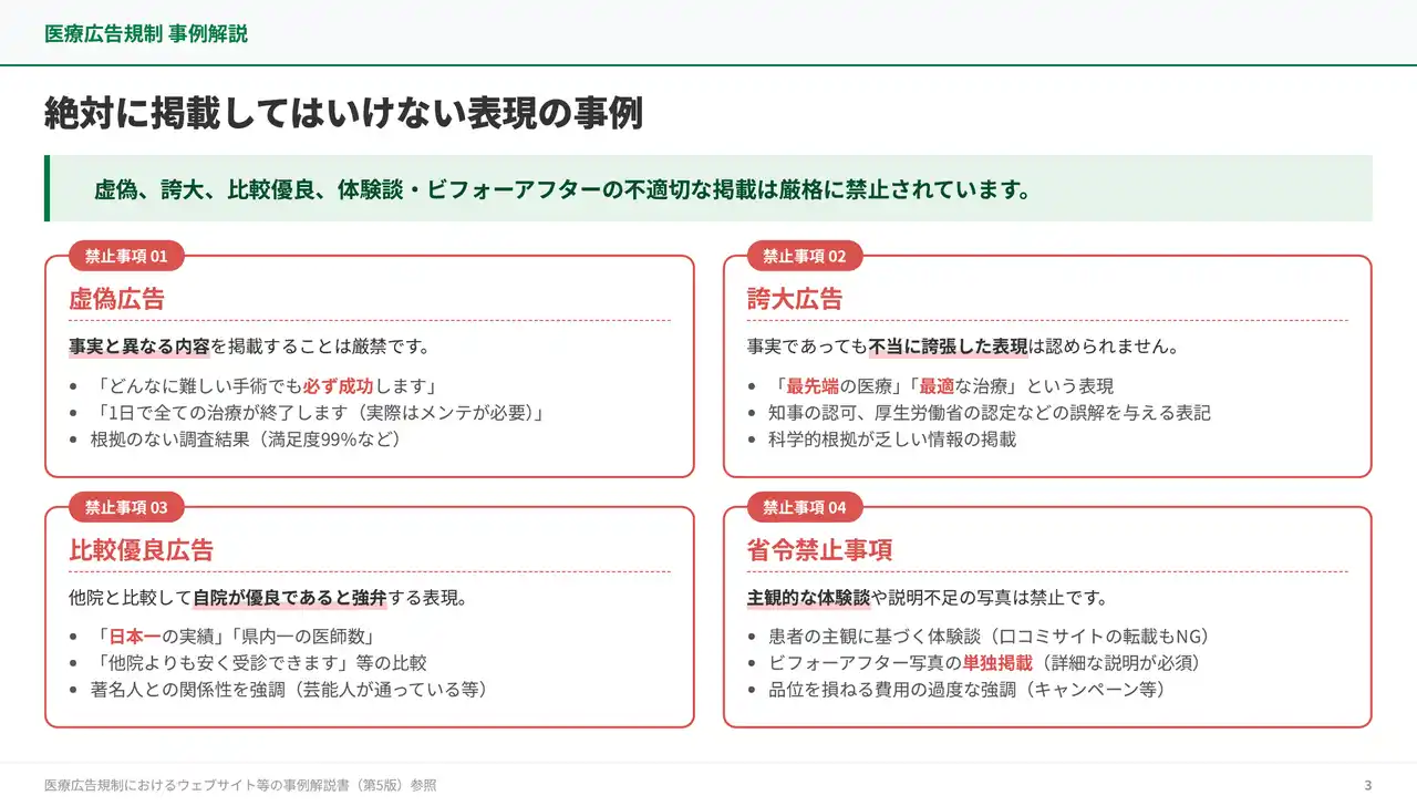 3つ目は「広告ルール変更のクライアント説明スライド」です。クライアント(広告主)を対象に、公的文書の変更点を出典付きでわかりやすく説明するスライドを生成できるサンプルです。広告規制や業界ルールの変更があるたびに全クライアント向けに説明資料を準備する必要があるものの、公的文書から要点を抽出してスライドにまとめ直す作業に手間がかかるという課題に対応しており、公的文書PDFを素材として投入するだけで、変更点が整理された説明スライドを短時間で作成することが可能です。広告規制・業界ルールの変更時に、全クライアントへ迅速かつ正確に情報を届ける体制を構築できます。 |