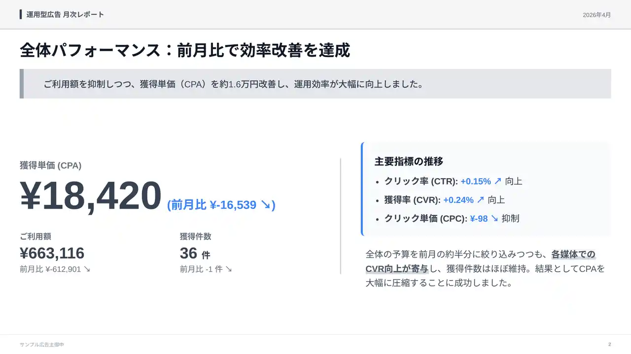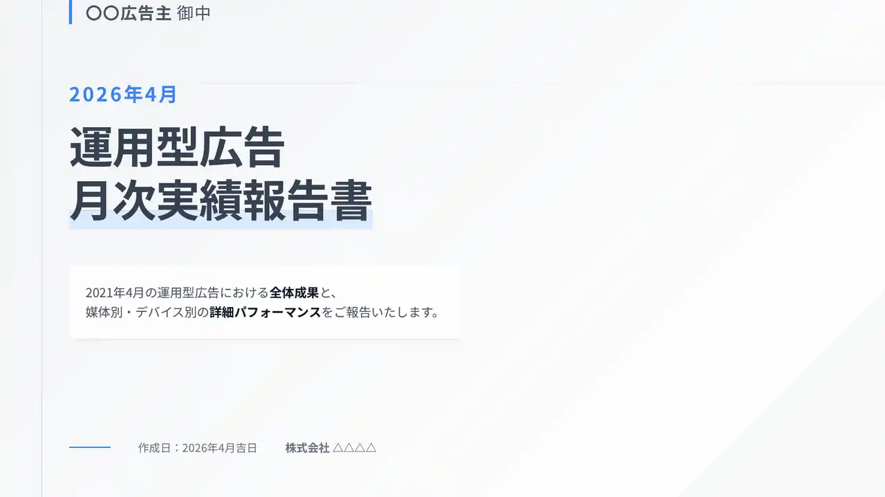 2つ目は「月次レポートスライド」です。クライアントを対象に、広告運用の成果をグラフ・数値で報告するスライドを生成できるサンプルです。毎月、全クライアント分のレポートスライドを作成する必要があるものの、クライアント数が増えるほどレポーティング作業に時間が取られ、施策改善に集中しにくくなるという課題に対応しており、広告運用レポートPDFやリサーチデータを素材として投入するだけで、成果が可視化された月次レポートスライドを効率的に作成することが可能です。レポーティング業務の負担を軽減し、施策の分析や改善提案により多くの時間を確保できます。 |