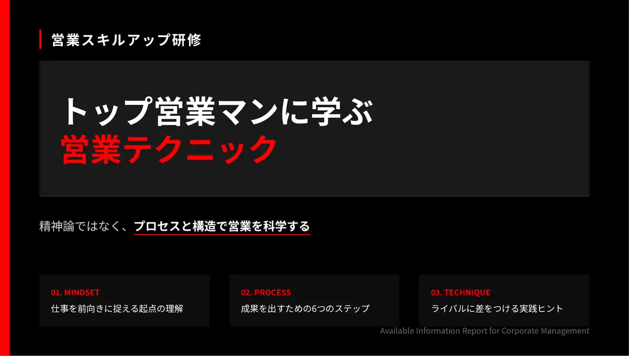 4つ目は「社内向け研修用スライド」です。社内スタッフ(営業・プランナー)を対象に、業界知識を共有するためのトレーニングスライドを生成できるサンプルです。定期的な勉強会用のトレーニング資料を継続的に整備したいものの、クライアントワークが優先されるため社内向け資料の作成に手が回りにくいという課題に対応しており、業界レポートPDFや社内資料を素材として投入するだけで、勉強会で活用できるトレーニングスライドを効率的に制作することが可能です。クライアントワークに追われる中でも、定期勉強会用の研修コンテンツを継続的に整備し、社内の知識共有とスキルアップを推進できます。 |