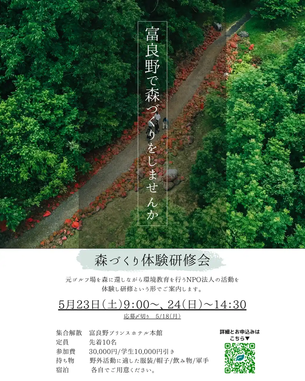 | 本企画は、富良野自然塾を持続可能にしていくための取り組みです。まずは取り組みを知っていただき、仲間を募り、森づくりのノウハウと環境教育の手法などを体験していただきたく、開催を決定しました。なので、体験型の研修会という形式を取らせていただきました。 | |||