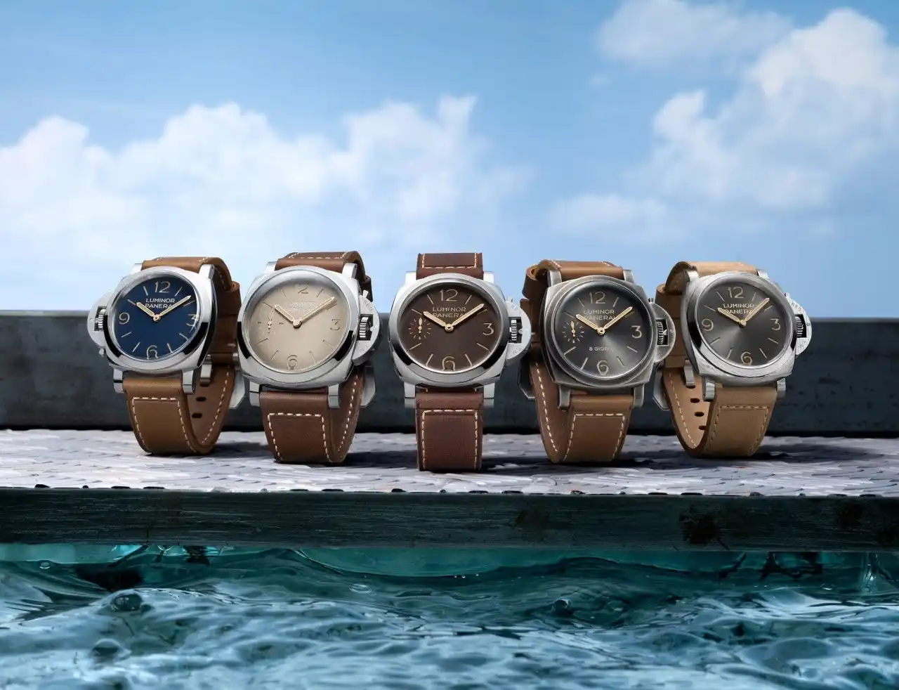 左から ルミノール デストロ 税込136万4000円、ルミノール 47mm 税込184万4000円、ルミノール 44mm 税込136万4000円、ルミノール オットジョルニ 税込168万3000円、ルミノール フォージドチタン 税込352万円 |