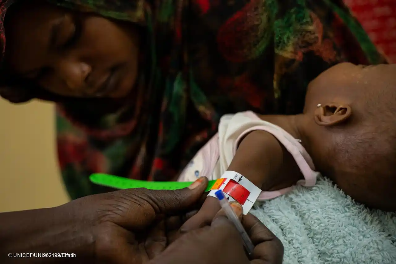 ジャジーラ州の保健センターで、上腕計測メジャーを使った検査により栄養不良を意味する「赤」が示された子ども(スーダン、2026年3月16日撮影) (C) UNICEF/UNI962499/Elfatih |