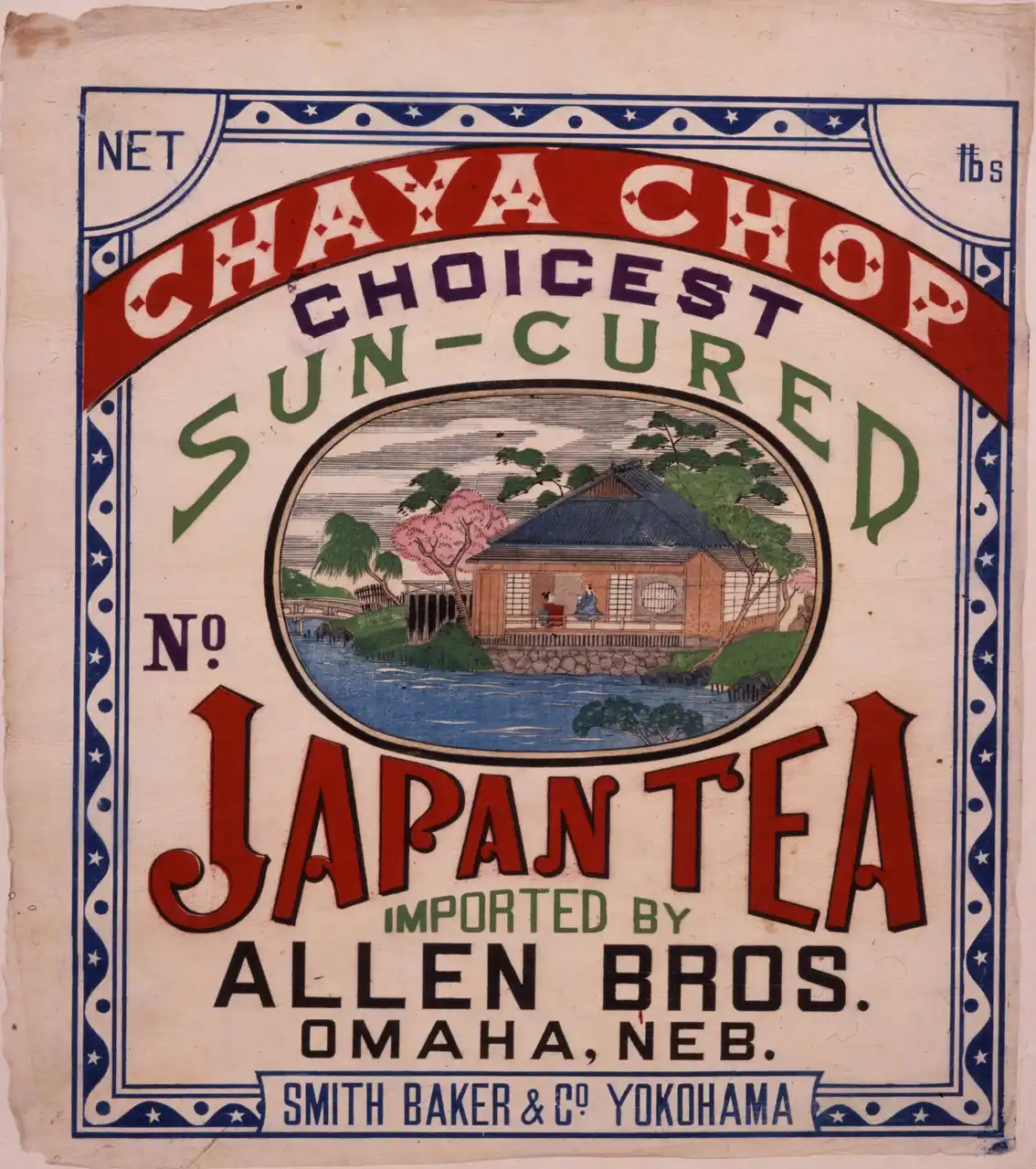 幕末の開港により輸出茶が始まり、当初の茶箱には錦絵師による「茶箱絵」が貼られていた。 その後、茶の種類や商標を記した輸出ラベル「蘭字」が作られるようになり、明治期以降広く使われるようになった。蘭字は浮世絵職人によって作成され、カラフルな多色刷りで、富士山や桜など、日本を象徴するモチーフの絵が配置されており、「JAPAN TEA」と記されていた。日本文化を海外に伝える広告に似た意味もあったと見られており、日本のグラフィックデザインの先駆けとも言われている。 |