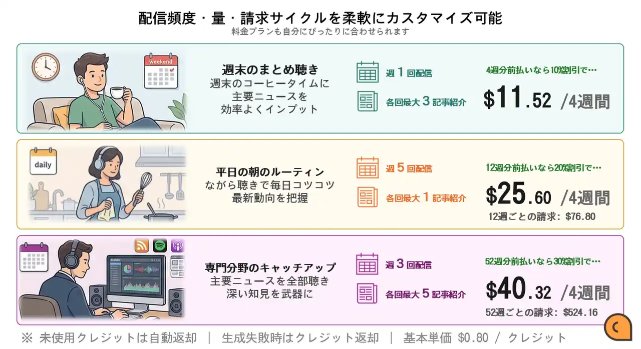 1エピソードあたり「基本コスト + 記事数」に応じて消費し、配信頻度や請求サイクルをカスタマイズできるフレキシブルな料金体系です。また、以下の設計によりユーザーリスクを最小化しています。 |
