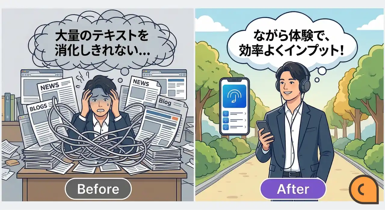 近年、情報収集の対象は増加しており、文字ベースでのキャッチアップには多くの課題が存在しています。毎日大量のテキストを読む時間を確保することができず、情報を消化しきれない状況が続いています。また、自分の関心や必要な量に完全に一致する音声コンテンツも不足しています。既存のポッドキャストは「多くの誰か」に向けた内容であり、個々の関心に最適化されていません。 |