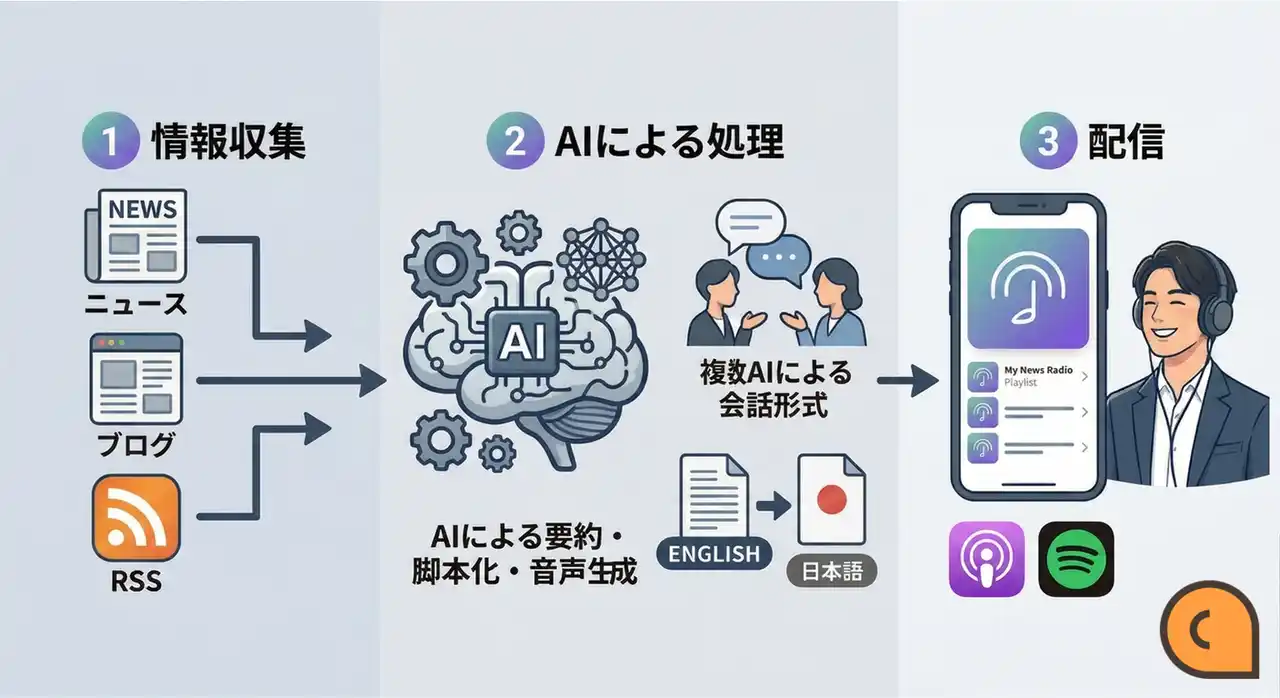 ユーザーが選択したRSSソースをもとに、AIが内容を整理・再構成し、「自分のためだけ」の番組を生成いたします。英語のフィードを設定することにより、英語圏の最新情報を日本語で聴くことも可能です。 |