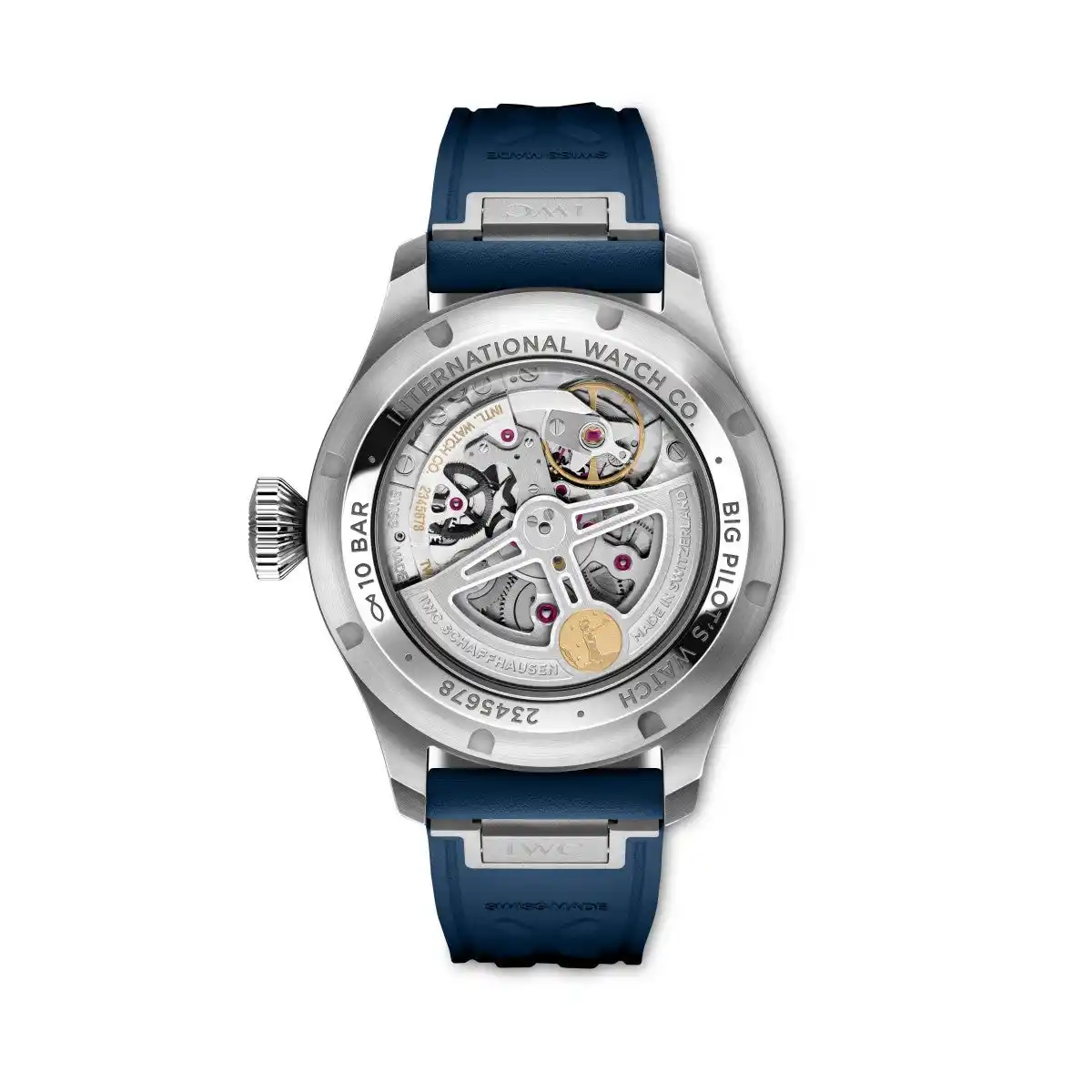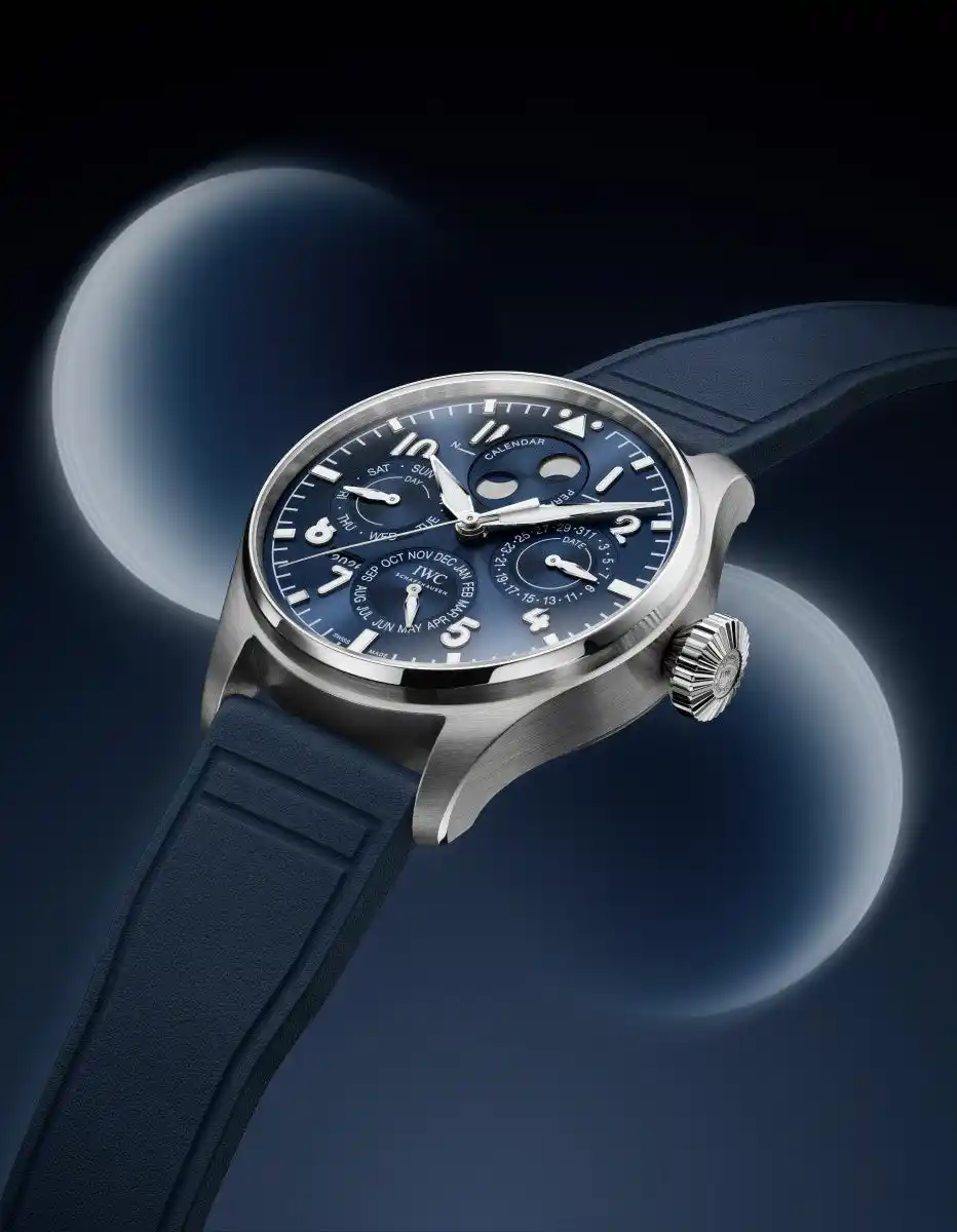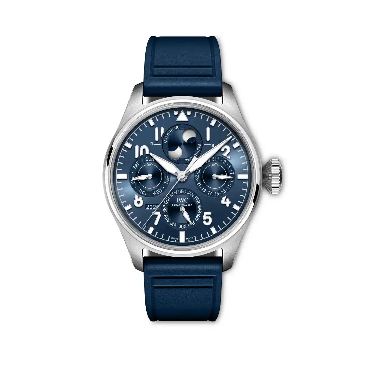 . 「ビッグ・パイロット・ウォッチ・パーペチュアル・カレン ダー・プロセット “プティ・プランス”」(Ref. IW329601) は、直径42 mmのステンレススティール製ケースと、 EasX-CHANGEシステムを装備した5列ステンレスス ティール製ブレスレットを備えています。ディープブルーの文字盤のインデックスと数字はロジウムメッキのアプ