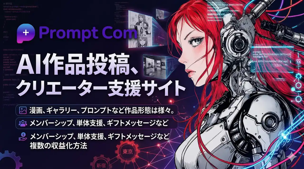 PromptComは、AI技術を活用して制作されたイラスト・漫画・プロンプトなどの作品を投稿し、収益化・ファンとの交流・SNS的な発信がすべて一体となった、AIクリエイターのためのオールインワンプラットフォームです。 |