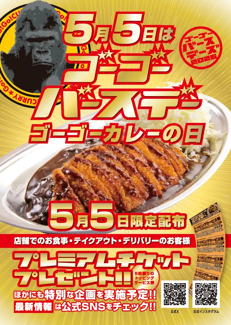 株式会社ゴーゴーカレーグループ(本社:石川県金沢市、CEO兼代表取締役社長:西畑 誠、以下 ゴーゴーカレー)は、2026年4月23日~5月5日の間、「ゴーゴーバースデー(=5月5日 / ゴーゴーカレーの日)」に向けた連続キャンペーン企画として「ゴーゴーバースデーズ」を実施いたします。 |
