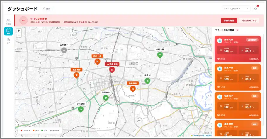GPSによる位置把握。夜間・単独作業中の異常も即時対応 |