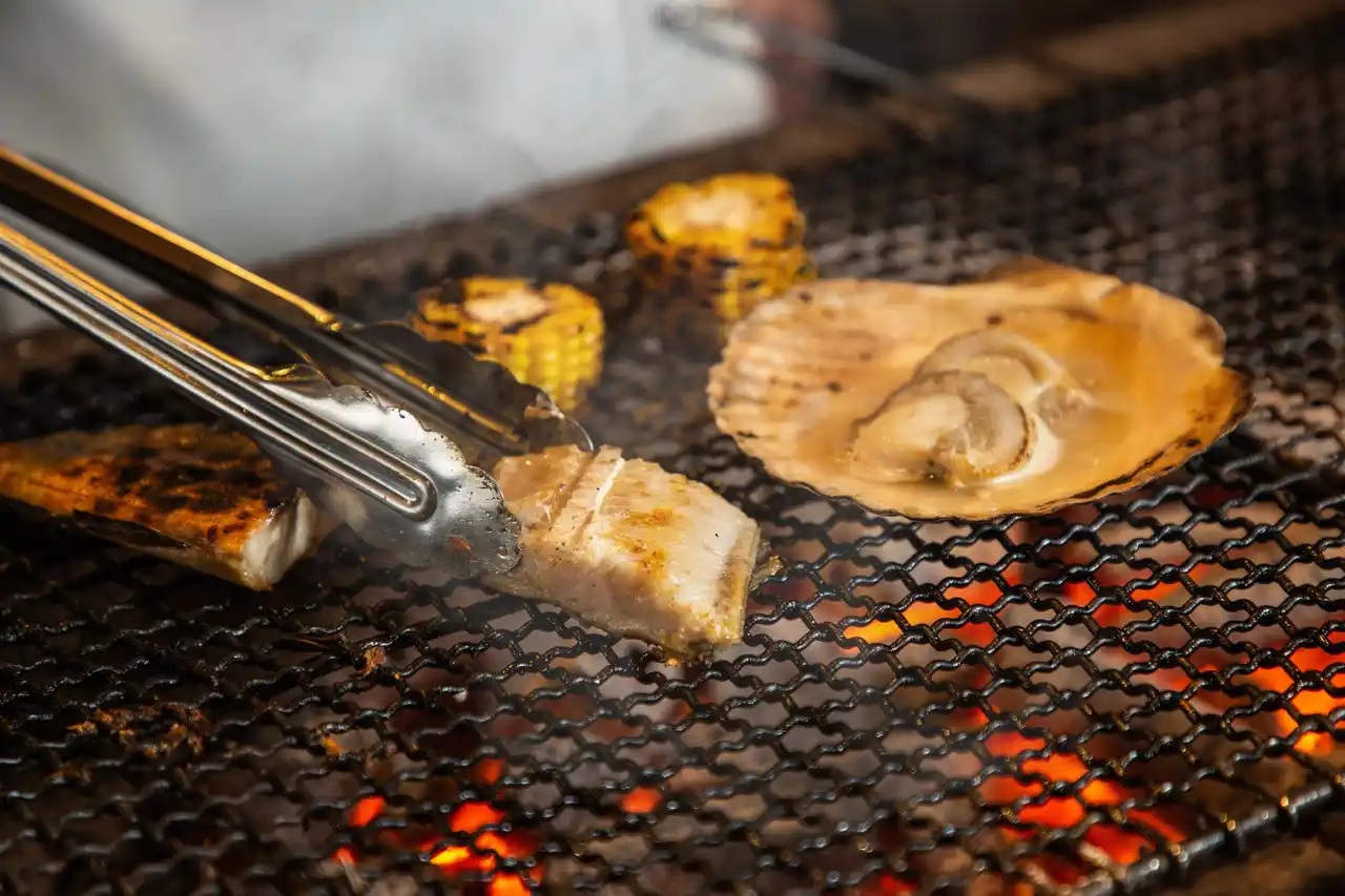 | 濃厚な甘みが魅力の身を、炉端の炭火でじっくり炙り、香ばしさと旨みを引き出します。 | ||||||||||||||