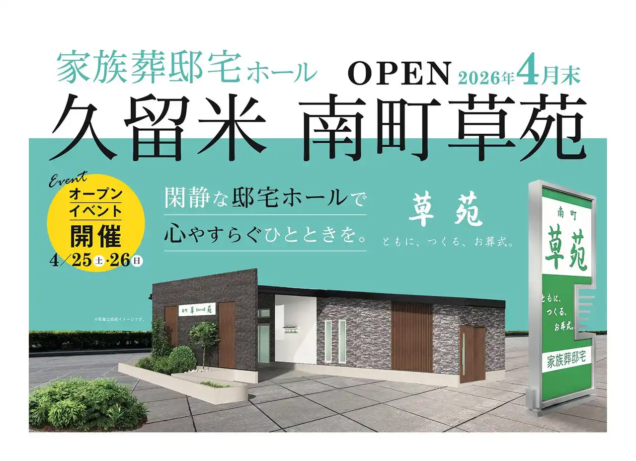 木下株式会社 草苑(本社:久留米市野中町、代表取締役社長:木下幹朗)は2026年4月、久留米市南4丁目に“家族葬”に特化した新施設「南町草苑」をオープンいたします。日本の高齢化率29.1%に対し、久留米市は2040年には34%と予測されています。また、全国調査では家族葬が50.0%に達するなど、葬儀の小規模化が加速しています。 |