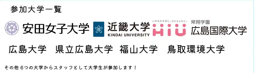 安田女子大学、近畿大学、広島国際大学、広島大学、県立広島大学、福山大学、鳥取環境大学、その他6大学から大学生がスタッフとして参加予定です。学部・学科も、理学、工学・情報、農学・環境、教育・心理、経済・経営・地域、医療・薬学、デザイン・映像、観光・国際など幅広い分野をカバーしており、高校生が関心分野ごとに大学を比較しやすい構成となっています。 |