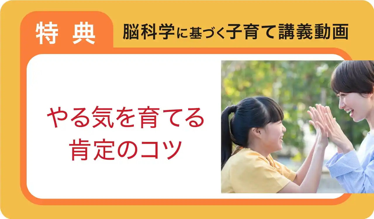 本特典動画では、子どものやる気を育てる関わり方について、外発的・内発的動機づけの観点から解説しています。ダウンロードはこちら<https://www.agentmail.jp/lp/r/17872/147774/> |