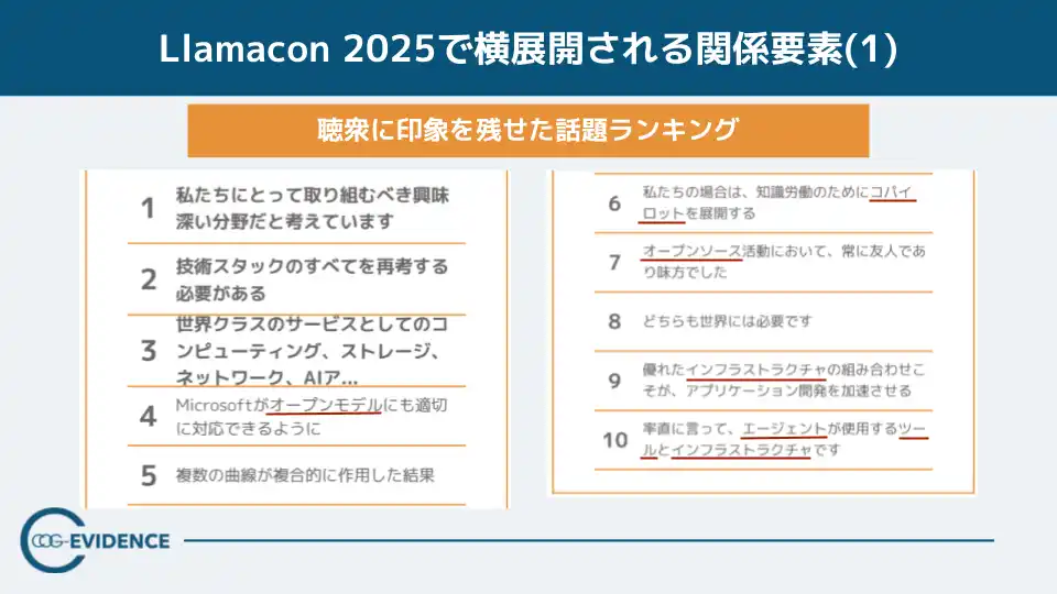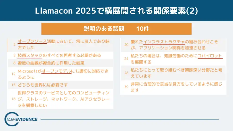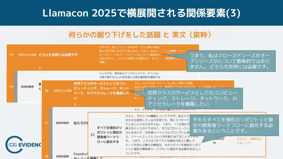知識表現AIを用い、会話・文章情報から組織課題を可視化するコグニティ株式会社(本社:東京都品川区、代表取締役:河野理愛、以下「コグニティ」)は、Metaが開催した「LlamaCon 2025」を対象に、キーノートの発話構造を分析した調査レポートのサマリーを公開しました。LlamaCon 2025は、ライブ感を持たせながら話は具体的な点から始まり、様々に分岐しながら主題を語るという構造上の特徴を示しました。さらに話題の群を確認すると、その分岐は単なる論点の多さではなく、AI時代の重要要素を横に並べて展開させながら関連付けて全体像を提示する“進み方”として現れていました。 |
