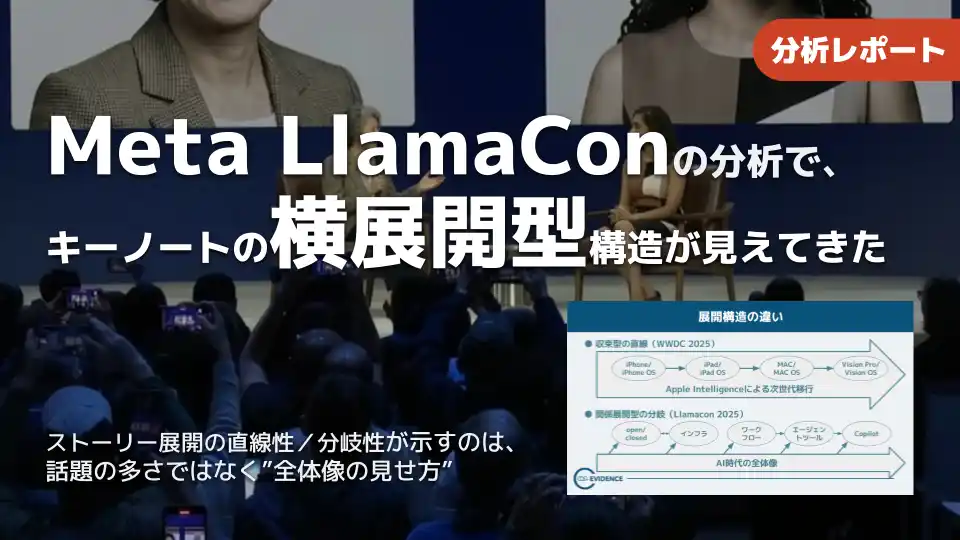 コグニティはこれまで、さまざまなキーノートの違いは単一の比較指標では説明しきれず、少なくとも「提示形態・起点設定・展開構造」という伝達設計三要素の組み合わせが必要であることを示してきました。その中で「展開構造」については、直線性が強い回/分岐性が強い回があること自体は示せる一方で、それぞれがどのような“進み方”を意味するのかは、なお整理の余地がありました。今回、LlamaCon 2025を加えて分析したことで、分岐性の強い構造が持つ意味を、より具体的に読み解くことができました。 |