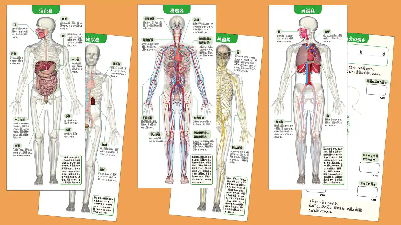 ▲消化器、泌尿器、循環器、神経系、呼吸器の器官系シートと「自分の長さ」シート |