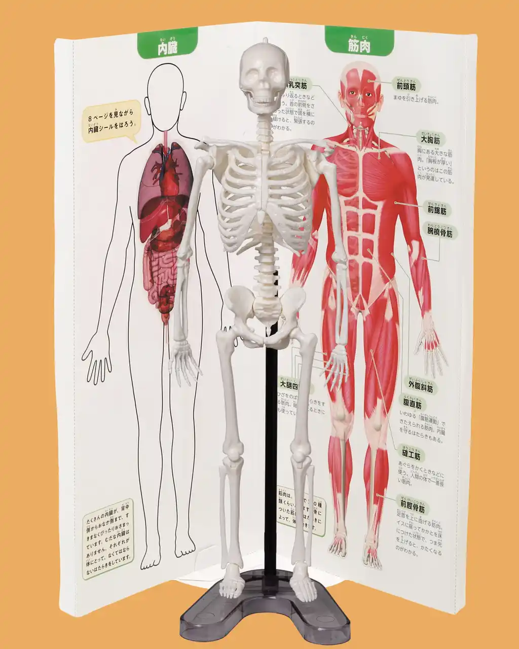 高さおよそ30cm、成人の約1/6サイズの人体骨格模型を組み立てて学べるキット。リアルな模型をパズルのように組み立てるうちに、体のつくりがよくわかります。骨格模型だけでなく、「人体白地図パネル」やパネルにはる「内臓シール」、パネルを着せかえられる「器官系シート」もついて、骨と筋肉や内臓の位置関係もしっかりと学ぶことができます。パイプにさして立たせたり、ぶら下げたり、座らせたりできるので自由に飾れて、小学生から大人まで楽しめます。 |
