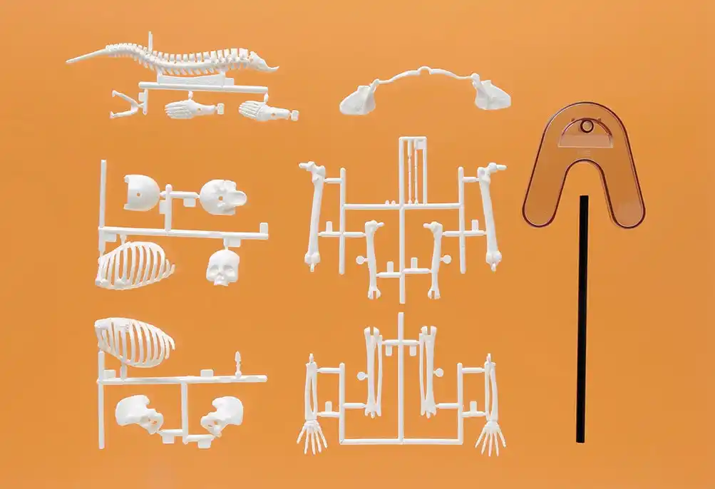 ▲骨格模型の全パーツと台とパイプ |