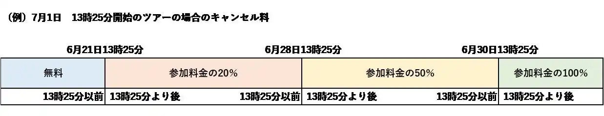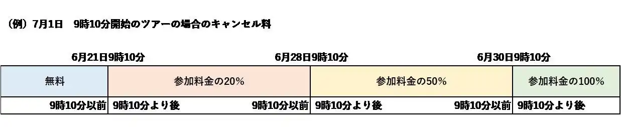 ツアー参加日時の前日の9時10分より後および無連絡不参加 |