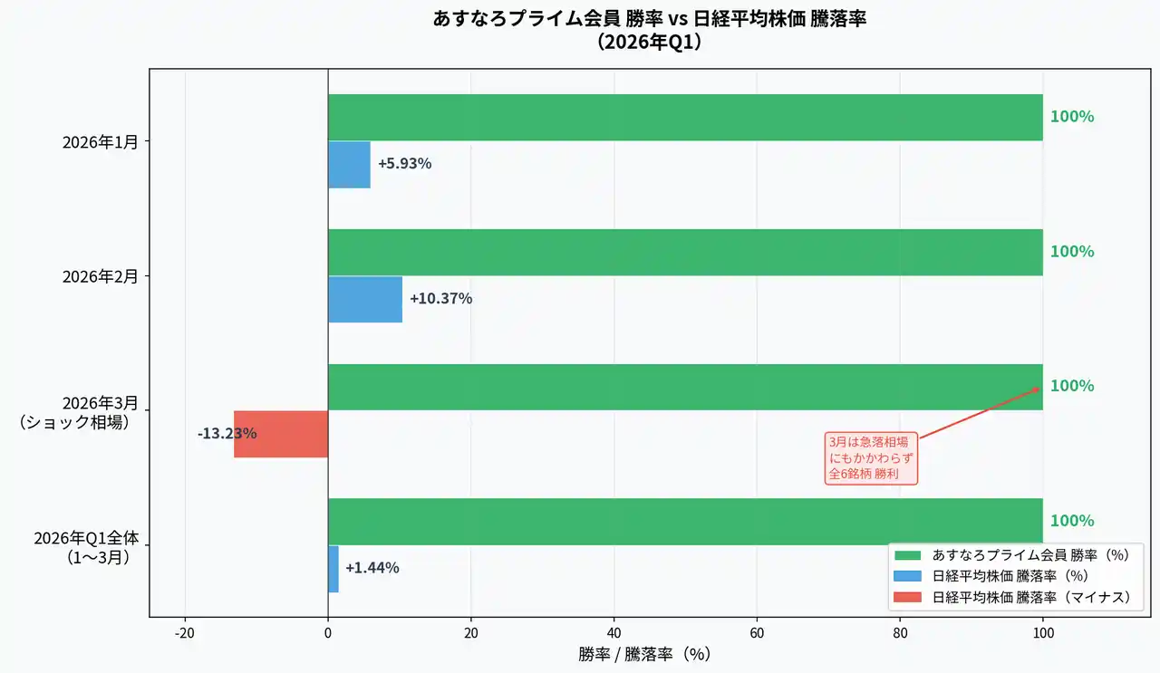 株式会社あすなろ(本社:東京都港区、代表取締役:大石やすし、以下「あすなろ投資顧問」)は、提供する売買助言サービス「あすなろプライム会員」において、2026年第1四半期(1月~3月)に推奨した限定大型株全12銘柄のパフォーマンス分析結果を公表いたします。本期間は日経平均株価が3月に月間7.4%下落する急落局面(ショック相場)に見舞われましたが、あすなろ投資顧問の推奨銘柄は市場の荒波を跳ね返し、全銘柄で目標達成または利益確定の提言を行うという圧倒的な成果を収めました。 |