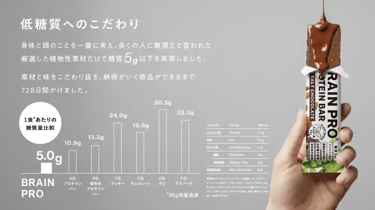 「体に良くても美味しくなければ続かない」という考えのもと、理想的な商品設計の完成まで2年と延べ200回以上の試行錯誤を経て完成。糖質5g以下でありながら、チョコレートバーとしての満足感と美味しさを兼ね備えています。 |