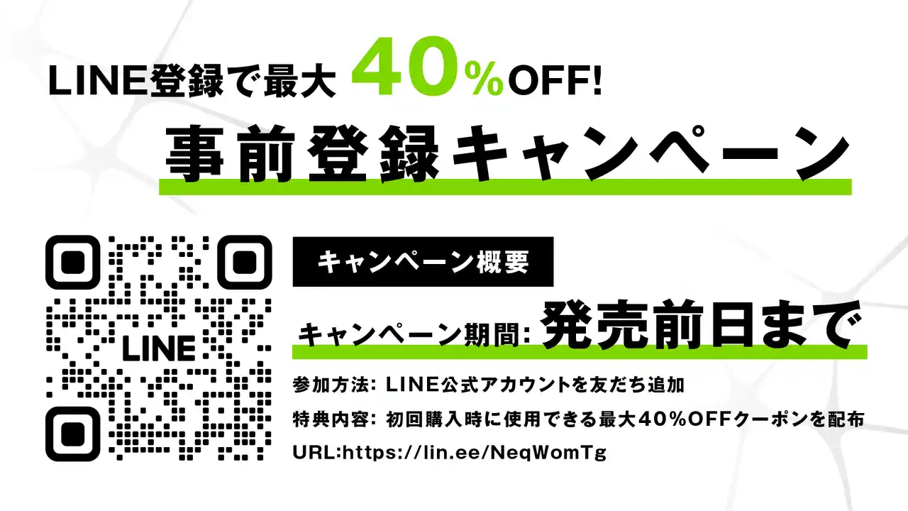 発売に先駆け、本日より公式サイトの公開、およびLINE公式アカウント登録で「最大40%OFF」となる事前登録キャンペーンを開始しました。