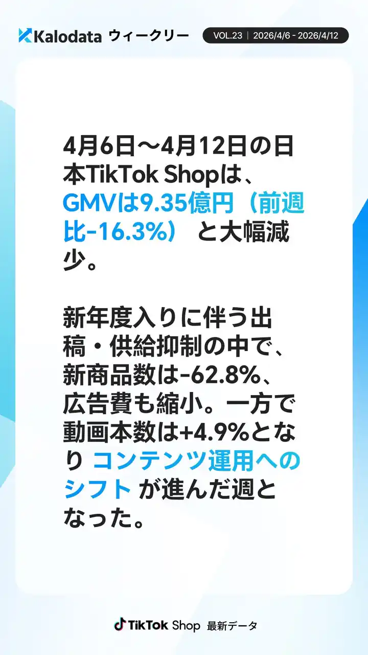 TikTok Shopデータ分析サービスKalodata Japan(運営:株式会社Kalowave Japan)の最新データによると、4月6日~12日の日本TikTok Shop市場は、GMVが前週比-16.3%の9.35億円と大幅減少し、新商品数や広告投資も縮小するなど調整局面に入った。 |