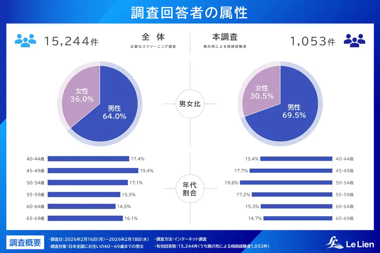 相続・終活のプラットフォーム「みんなの相続窓口」「みんなの終活窓口」を展開する株式会社ルリアン(京都府京都市、代表取締役会長兼 CEO:藤巻 米隆)は、15,244 人(うち親の死による相続経験者 1,053人)を対象とした「相続・終活に関する全国調査2026」を実施しました。今回は結果報告の第1弾として、4月27日の「相続土地国庫帰属制度」施行から 3 年を迎えるのを前に、親の死による相続経験者のデータに基づき、制度の認知度や不動産管理の実態を報告します。 |