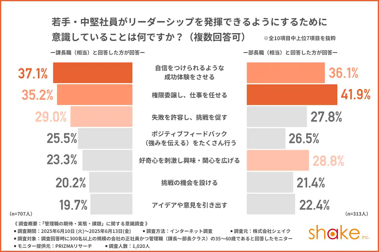一方で部長職は『好奇心を刺激する』ことに力を入れ、視野を広げる働きかけを意識しているようです。全体として、リーダー育成には経験と心理的安全性、主体性の醸成が鍵となっていることがうかがえます。 |