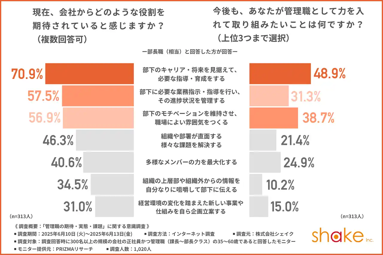 株式会社シェイク(所在地:東京都千代田区、代表取締役社長:吉田 実)は、300名以上の規模の会社の正社員かつ管理職(課長~部長クラス)の35~60歳の方を対象に、「管理職の期待・実態・課題」に関する意識調査を実施しました。