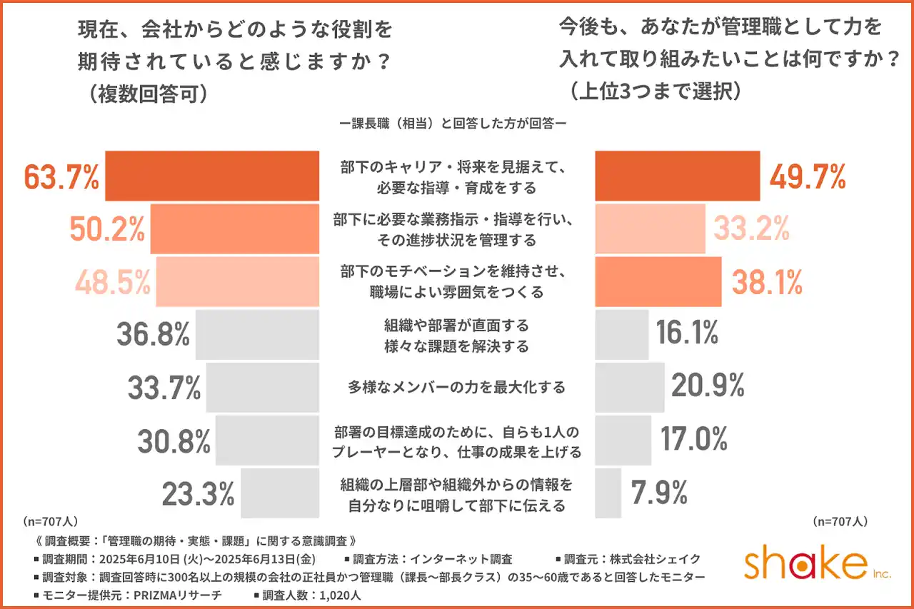 今回、株式会社シェイク(https://shake.co.jp/)は、300名以上の規模の会社の正社員かつ管理職(課長~部長クラス)の35~60歳の方を対象に、「管理職の期待・実態・課題」に関する意識調査を実施しました。 |