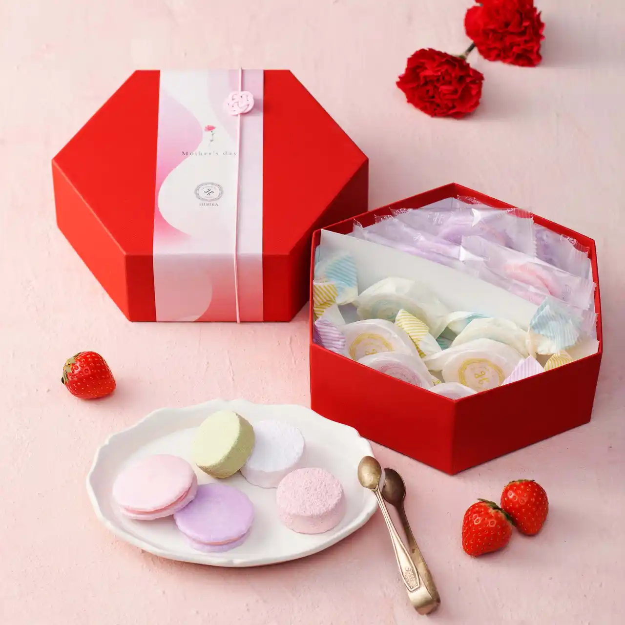| 春らしい彩りのふやきにクリームをサンドした“彩ふわり”、 お口に入れるとほろほろ溶ける“春のクッキー(ポルボロン)”を詰め合わせました。華やかな味わいが母の日の贈りものにぴったりです。 | |||||||||
