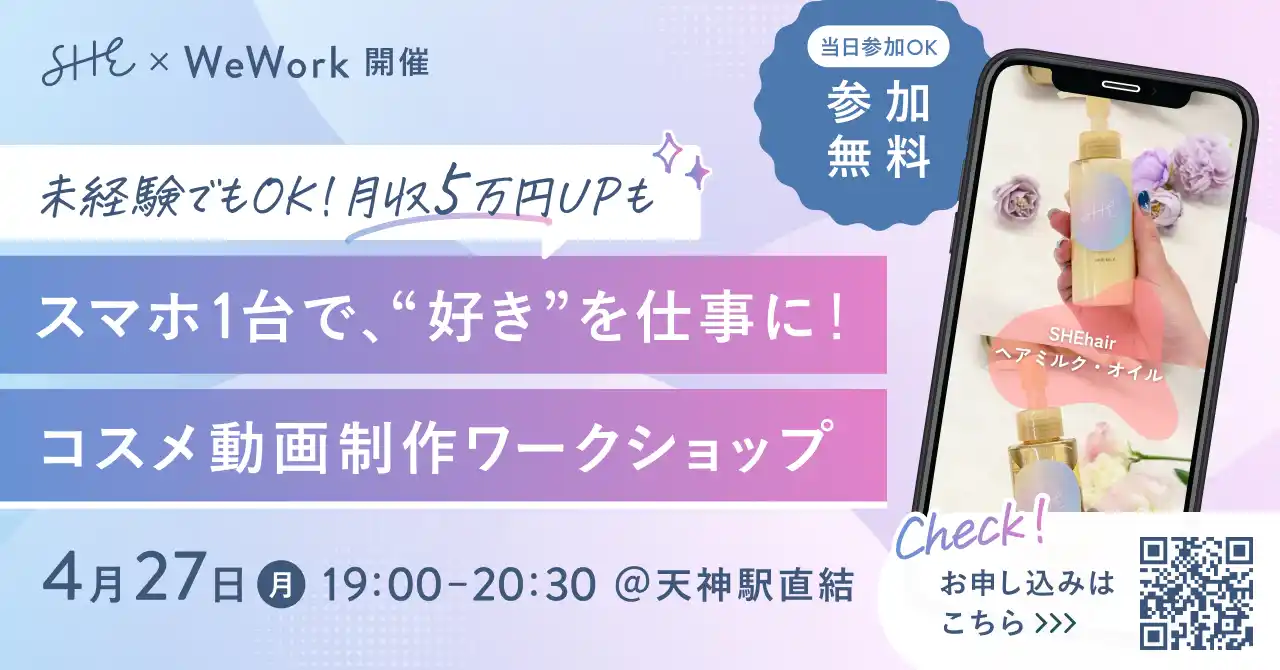 学ぶから働くまでを支援する女性向けキャリアスクール「SHElikes(シーライクス)」を運営するSHE株式会社(所在地:東京都港区、代表取締役CEO/CCO:福田恵里、以下SHE)は、どなたでも無料で参加いただける一般向けイベント「スマホ1台で“好き”を仕事に!コスメ動画制作ワークショップ」を、SHEの福岡拠点「SHE Fukuoka」にて2026年4月27日(月)に開催いたします。 本イベントは、未経験の方でもスマートフォン1台で動画制作スキルを学べるワークショップ型イベントです。「動画制作に興味はあるが、何から始めればよいかわからない」「収入を増やすために副業・フリーランスに役立つスキルを身につけたい」と考える方に向けて、未経験者や初心者も実践的に学べる内容をご用意しています。 |