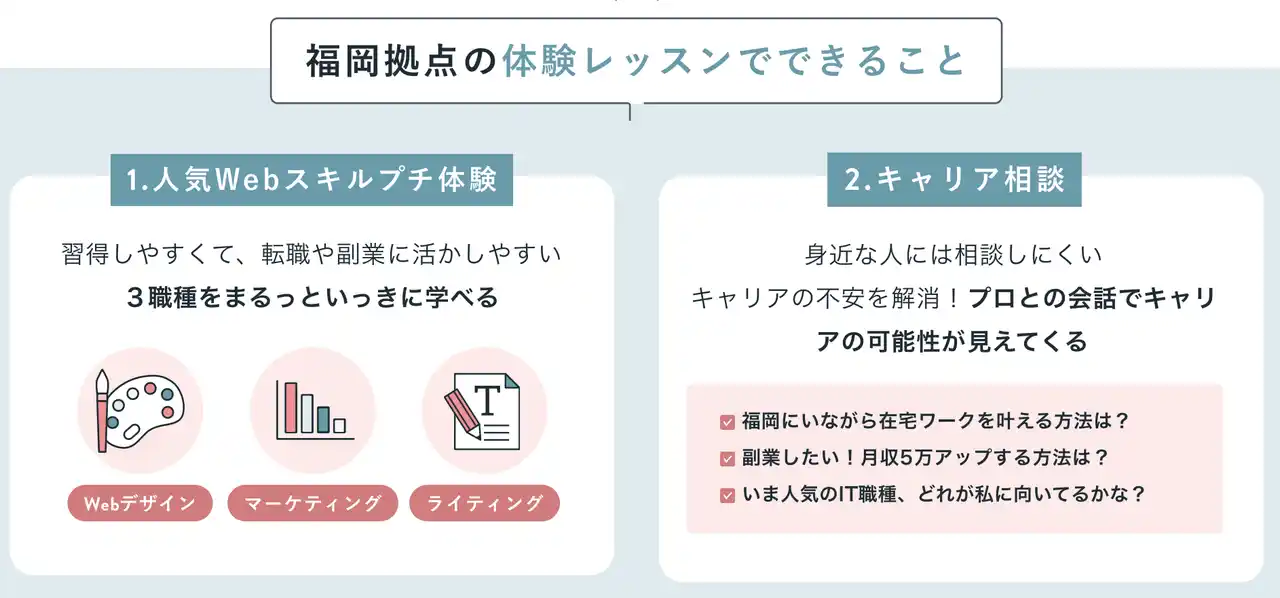 | 九州エリアでは初となる拠点「SHE Fukuoka」は、九州の皆様の「学ぶ・働く・つながる」が実現できる場として、新規の方へのSHElikesのご案内・キャリアカウンセリング、スキルアップ支援、コミュニティ形成を目的に運営いたします。無料体験レッスンはSHE FukuokaのWebサイトよりお申し込みください。 | |||||||||