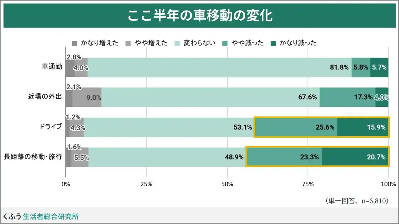 「ドライブ」「長距離の車移動」は4割以上の人が「減った」と実感 |