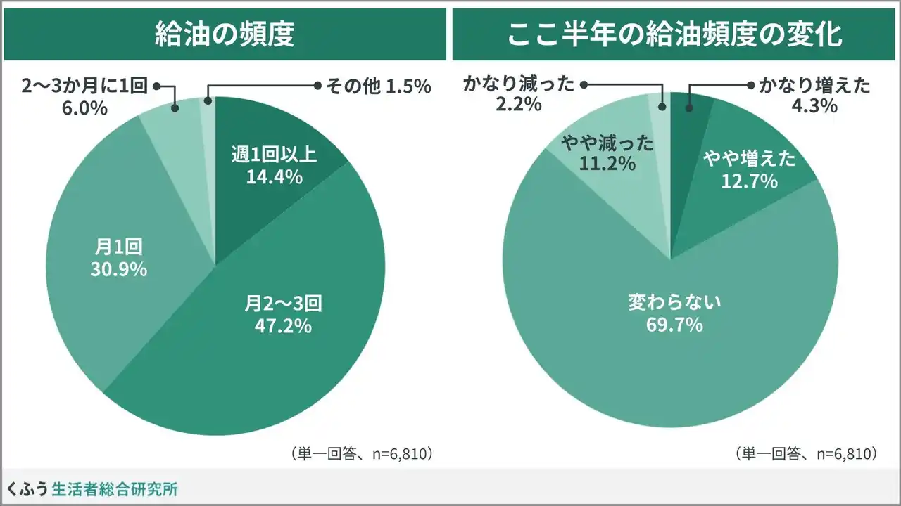 給油については「月2~3回」(47.2%)が最も多く、次いで「月1回」(30.9%)が多い結果となりました。給油頻度はここ半年では目立つ増減はありません。 |
